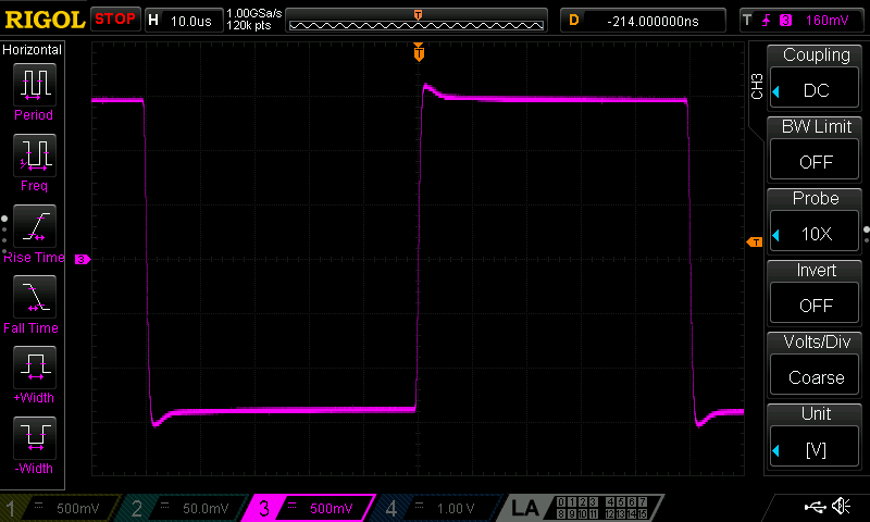 Ob ein Verstärker stabil arbeitet lässt sich am besten mit einem Rechtecksignal abschätzen. Der Oszilloskop-Screenshot zeigt den Verstärkerausgang mit einer Belastung von 8 Ohm. Der geringe Überschwinger nach der steigenden oder fallenden Flanke ist unkritisch und der Wahl des Verstärkungsfaktors der Schaltung geschuldet. Wird eine etwas höhere Verstärkung gewählt ist auch hier alles "flach".