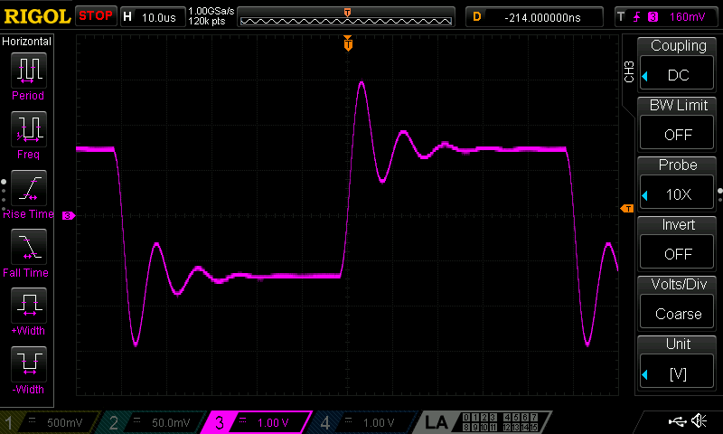 Hat ein Verstärker nicht genügend Phasenreserve reagiert er "allergisch" auf kapazitive Belastung. Deshalb wird stufenweise parallel zur Last ein Kondensator am Verstärkerausgang angeschlossen. Im hier gezeigten Fall sind das 100nF parallel zu den 8 Ohm. Zu erkennen ist ein etwas größerer Überschwinger nach der steigenden oder fallenden Flanke, aber keine Anzeichen von Instabilität.