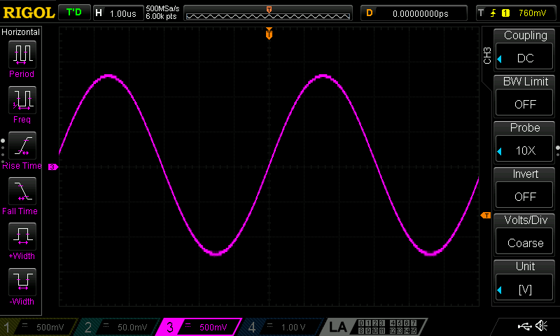 Dieses Diagramm stellt den -3dB Punkt des Verstärkers bei nominell 1Watt an 8Ohm dar. Abgelesen werden kann die Zeit für eine vollständige Sinuswelle von etwas mehr als 4µs, entsprechend einer Frequenz von ungefähr 250kHz.