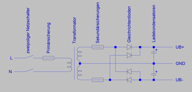 Wie im Schaltbild zu erkennen arbeitet der Verstärker mit dualer Betriebsspannung. Wie diese mit Hilfe eines Transformators und einer Gleichrichterbrücke erzeugt wird zeigt diese Prinzipschaltung: