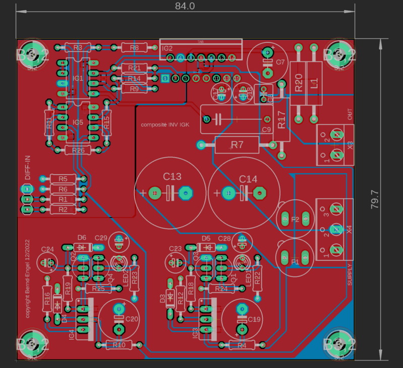 Um das simulierte in der Praxis nachzuprüfen braucht es einen Prototypen - hier ist er. Er funktioniert weitestgehend wie erwartet, lediglich die Klirrwerte erscheinen noch geringfügig zu hoch. Jetzt gilt es herauszufinden ob das Layout der Platine unvorteilhaft ist oder ob die Gegenkopplung der Eingangsstufe lediglich zu niederohmig ausgeführt wurde....